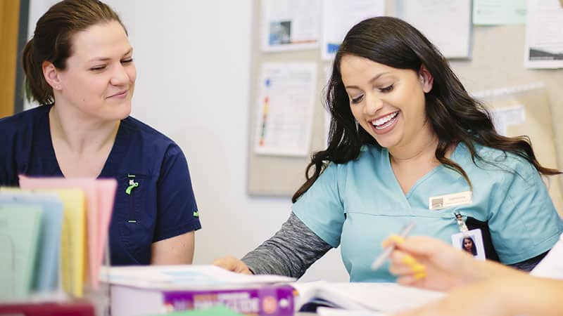 Two female healthcare professionals are sitting at a table, one smiling and looking down at paperwork while the other watches with a smile. They are in a bright office setting with stacks of paperwork and folders around them.